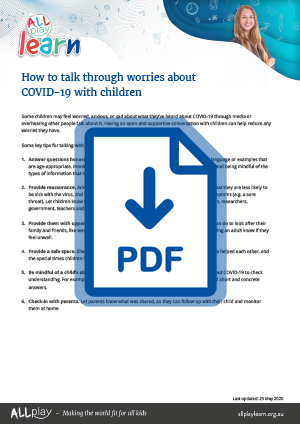 Some children may feel worried, anxious, or sad about what they’ve heard about COVID-19 through media or overhearing other people talk about it. Having an open and supportive conversation with children can help reduce any worries they have.